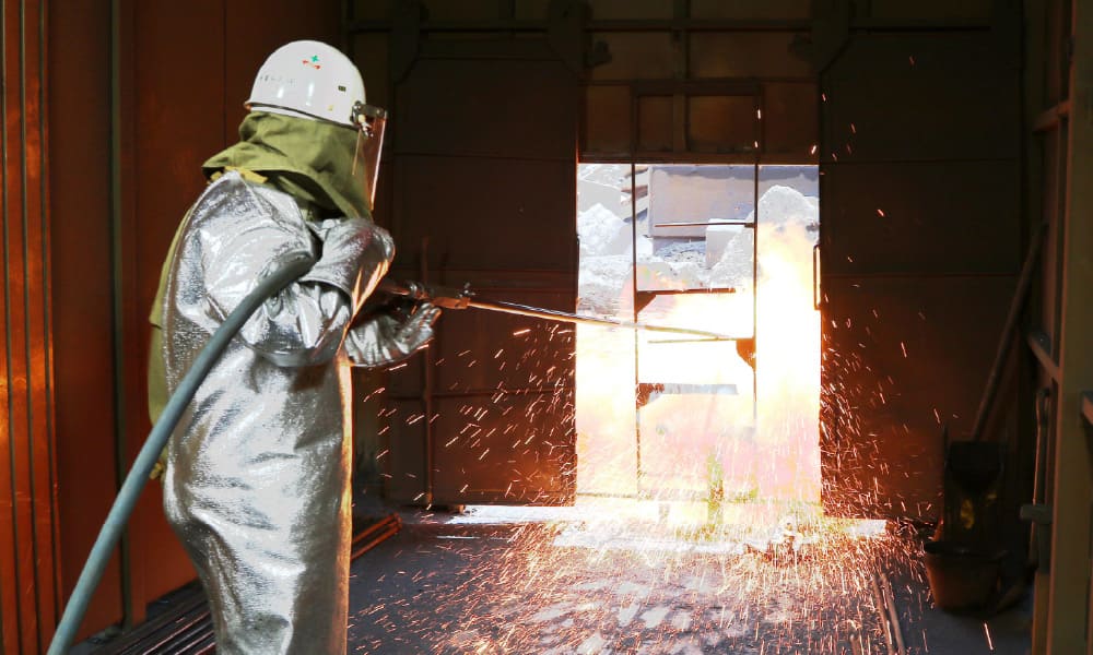 地金切断(溶断)作業とは、酸素パイプ切断方式によりノロ混入等でガス切断器では切断困難と判断される地金を、酸素ガスと鉄との酸化反応熱を利用して、切断機の代わりにパイプを溶かしながら地金を溶断していく方法です。造塊地金というノロと地金の混ざったものを酸素ガスの超高温燃焼と風圧で溶かして飛ばすイメージで切断、熟練には年月を要す半面、奥の深い作業のため従事者は常に向上心・達成感を得られる業務です。