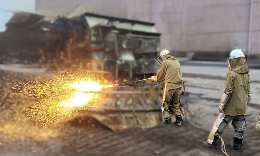 地金切断(溶断)作業とは、酸素パイプ切断方式によりノロ混入等でガス切断器では切断困難と判断される地金を、酸素ガスと鉄との酸化反応熱を利用して、切断機の代わりにパイプを溶かしながら地金を溶断していく方法です。造塊地金というノロと地金の混ざったものを酸素ガスの超高温燃焼と風圧で溶かして飛ばすイメージで切断、熟練には年月を要す半面、奥の深い作業のため従事者は常に向上心・達成感を得られる業務です。