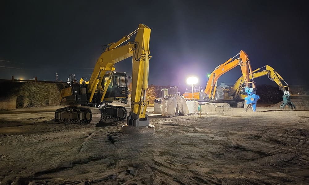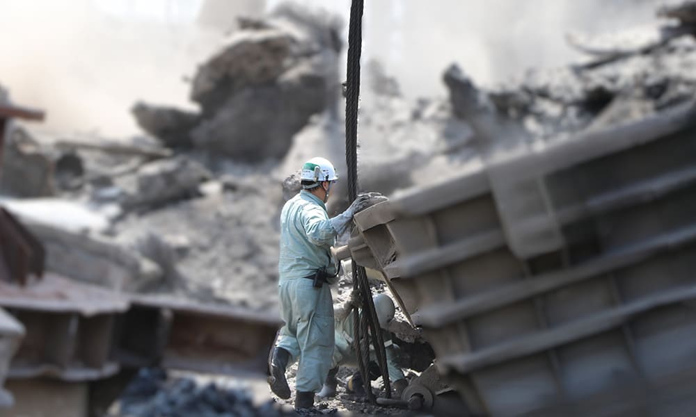 鉄鋼製品や鉄スクラップの運搬に不可欠なリフティングマグネットや、物を掴むためのグラップルなどの重機運転や操作を担当します。解体用機械や、整地・運搬・積込み用機械、さらに天井クレーンの操作なども行なっています。